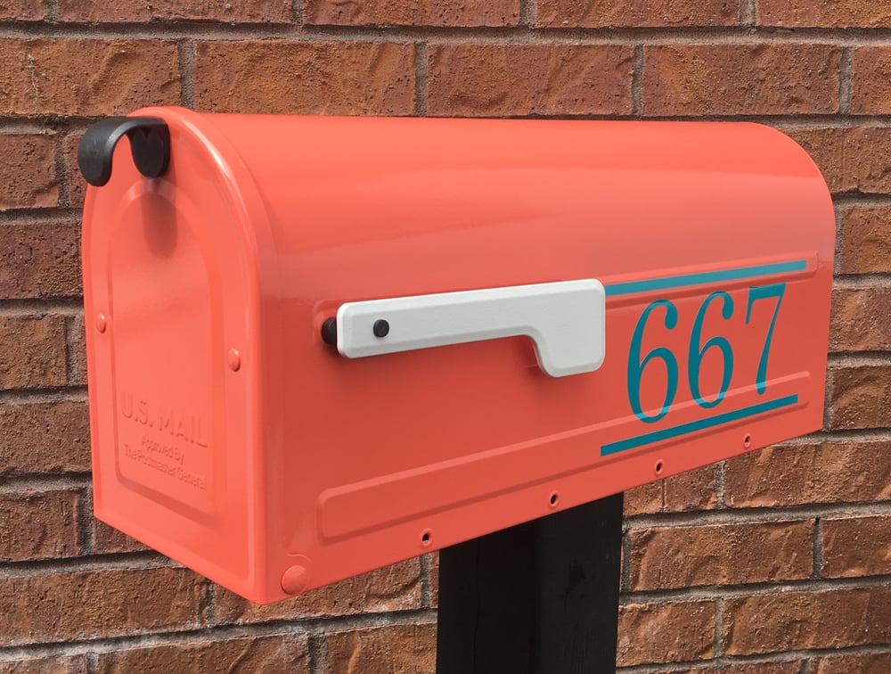 The mailbox in the picture is painted Coral, and the flag painted white. You can also specify the color for the lettering and numbers. If no lettering color is picked, I will use black or white, whichever contrasts better with the mailbox color.